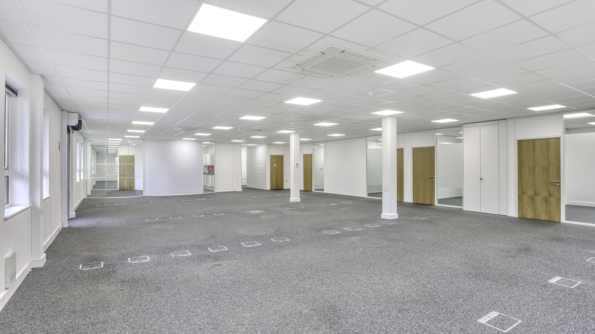 - Open plan space currently split into cellular offices, meeting rooms and breakout areas
